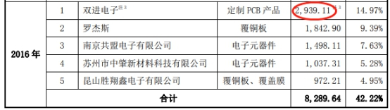 协和电子最新版招股书则显示,2016年向第一大供应商双进电子采购金额仅为2939.11万元,采购占比为14.97%。这一采购数额与2016年财报数据差-1063.9万元。