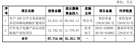 协和电子拟在上交所主板公开发行新股不超过2200万股,占发行后总股本的比例不低于25%。拟募集资金6.18亿元,其中5.00亿元拟用于“年产100万平方米高密度多层印刷电路板扩建项目”、1.18亿元拟用于“汽车电子电器产品自动化贴装产业化项目”。