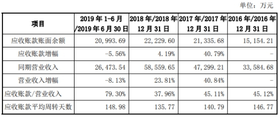 2016年-2018年及2019年1-6月,协和电子应收账款账面余额分别为1.52亿元、2.13亿元、2.22亿元和2.10亿元,占当期营业收入的比重分别为45.12%、45.11%、37.96%和79.30%。