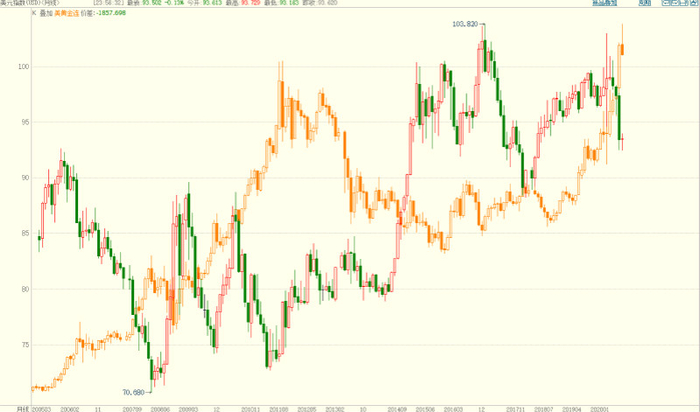 2005年至2020年黄金和美元指数走势的叠加图,橙色线为黄金月线,红绿色是美元指数月线