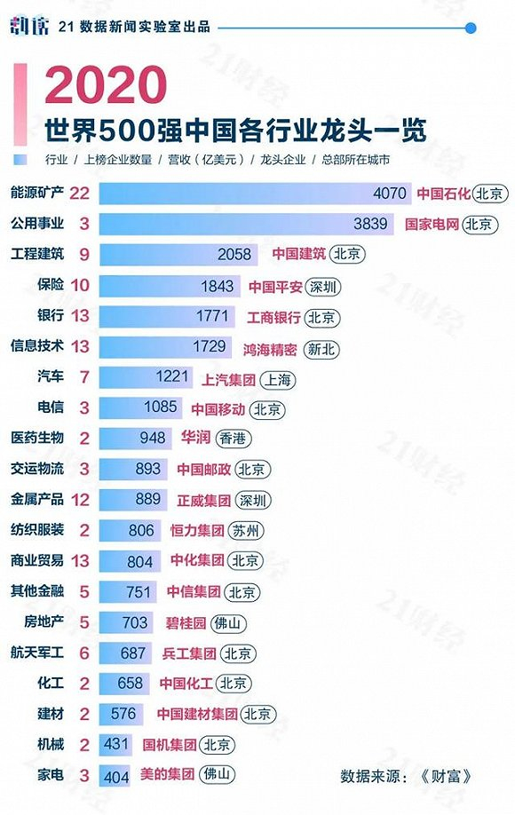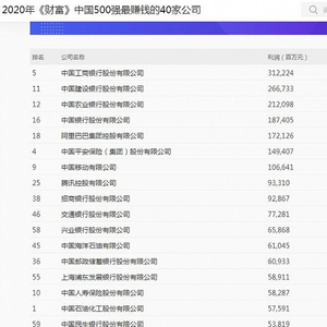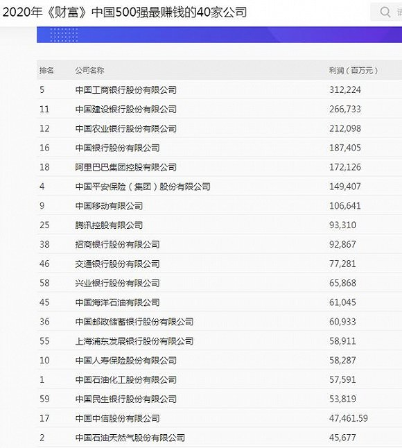 就上榜的中国企业看,行业分布最多的是能源矿产,中石化、中石油等,共22家;而利润最高、最赚钱的要数银行,工行、建行等。