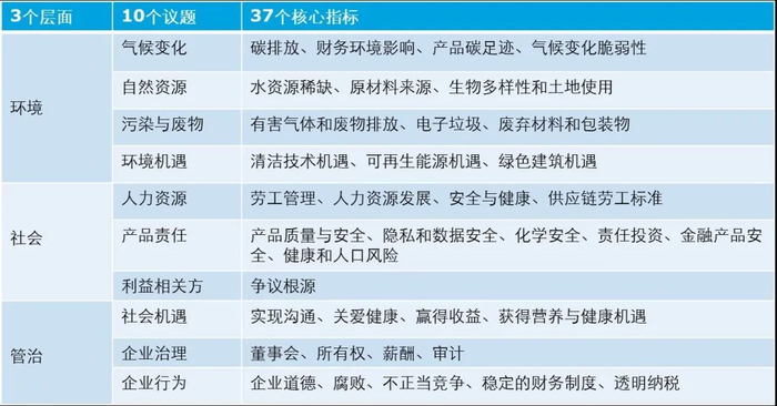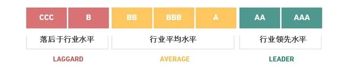 MSCI ESG评级内容主要由环境、社会及管治三个主要层面构成,涵盖10个议题和37个核心指标。在完成基本指标打分后,MSCI按照全球行业划分准则(GICS)将被评分者分为11大类,24个行业组别,69个行业及158个子行业,并按照不同行业中各议题的风险将各项核心议题分配5%-30%的权重。最终,相较于公司与同行业在标准和表现,企业的评分等级从高到底分为AAA、AA、A、BBB、BB、B、CCC七个等级。