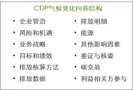 CDP问卷内容涵盖企业在气候变化、水、森林三个层面中战略、管理到实践各个环节的相关议题。以CDP气候变化为例,其问卷结构主要涵盖12类指标如下: