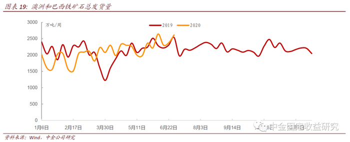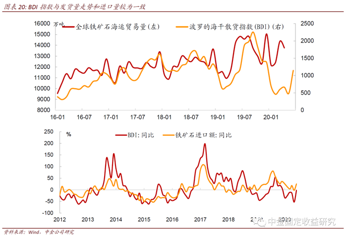 2020 年初至今铁矿石价格上涨的逻辑跟去年较为一致,都是因为供给紧缺导致价格上涨。澳大利亚 1-2 月由于台风的影响,发运量低于去年同期,3 月以来逐渐恢复至正常水平。而巴西由于受到强降雨量的影响,2020年一季度铁矿石共计发运同比下降 15.5%。除天气冲击外,今年铁矿石供给受到疫情的影响也较大。 Vale 将全年的产量指引由此前的 3.4-3.55 亿吨下修至 3.1-3.3 亿吨。一些非主流供应商如印度、土耳其、俄罗斯以及伊朗等,新冠疫情发展态势依然严峻,其铁矿石产量存在下行风险。因此,对于年内铁矿石价格的走势,很大程度上取决于供给端能否顺利恢复。从澳大利亚和巴西铁矿石近期的发货数据来看,近期澳洲和巴西铁矿石周度发货量有所修复。而波罗的海干散货运费近期明显回升,也侧面印证了铁矿石发货量逐渐修复。从历史上看,波罗的海干散货指数BDI以及主要运送铁矿石的波罗的海好望角型运费指数BCI走势跟铁矿石发货量以及我国铁矿石进口量走势较为一致,可以用于高频跟踪铁矿石发货情况。