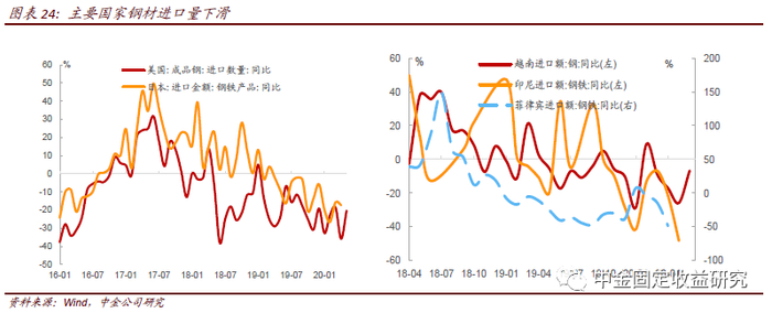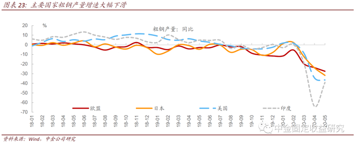 其他国家钢铁需求方面,世界主要的钢铁消费国家包括中国、欧盟、美国、印度、日本等。这些国家今年以来粗钢产量和进口量增速都出现了大幅下滑,这意味着除了中国国内复工复产后地产、基建等支撑了钢铁的表观消费外,其他国家对于钢铁的消费量其实是下滑的。
