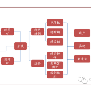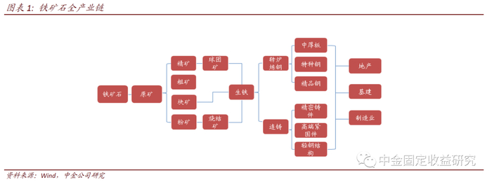 铁矿石是含有铁单质或铁化合物的能够经济利用的矿物集合体,位于黑色产业链上游。钢铁是国民经济支柱产业,而铁矿石几乎只作为钢铁生产原材料使用。直接开采的铁矿石根据粒度不同,通过烧结或者球团工艺处理后进入高炉冶炼。铁矿石根据物理形态分为块矿、原矿、粉矿、精矿和烧结矿、球团矿等。铁矿石油高品位矿和低品位矿之分,块矿是可以直接入炉的高品位矿,粉矿和精矿需要人工造块后才能投入高炉。烧结矿以粉矿为主要原材料,而球团矿以精矿为主要原材料。