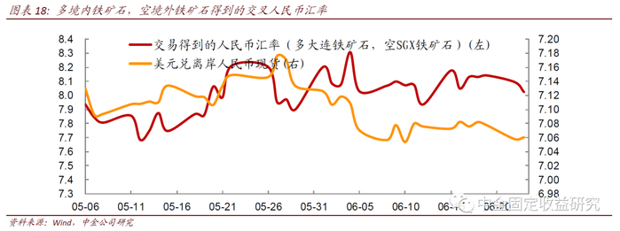 除了发现价格、套期保值等传统作用,铁矿石期货对金融机构而言还有一定的特殊功能。例如,投资者想要进行两地人民币的交易,可以直接选择在岸人民币和离岸人民币的产品,但是在岸人民币产品门槛较高,直接对冲难度较大;我们不妨将视野放大,考虑两地交易的活跃商品,大商所铁矿石作为近年异军突起的内盘品种,日均成交活跃且波动较大;而作为老牌铁矿石定价中心,新加坡交易所亦在近年推出铁矿石电子盘交易,且日均成交满足我们的套利需求,不失为一个好的标的,我们简单对2者进行分析,境内外铁矿石的比值与在岸人民币呈现一致性,两者相关性系数达到86.3%,统计意义上显著相关,可以用铁矿石两地交易价格的比值(单位均为100吨)进行交易达到交易人民币走势的目的。我们选取两个品种的日度结算价格做比值,其走势也与离岸人民币现货基本一致,我们认为基本可以达到对冲人民币汇率的效果。