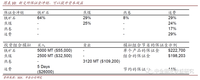 在新交所交易的优势在于,连续合约;成交机制灵活,SGX除了电子盘外还有OTC成交,合约品种多:铁矿石的品位(62%、65%)丰富,块矿溢价,对实物可以做更好对冲,期权交易更活跃;合约的到期时间丰富,不仅有每个月的基础品种,还有季度、年度的合约(全季/年统一价格打包),再衍生出基于季度、年度差的交易。交易有场内和场外,场外有inter-dealerbroker参与;为节省保证金,新交所可提供跨商品的保证金冲销(以下是范例,在新交所清算多种大宗商品时保证金节省了31 %(图10));在一个平台上,交易整个钢材价值链(铁矿石、焦煤、钢材、运费);有长达22小时的直通式实时交易和清算;只需一个清算协议,便可与不断增加的交易对手方进行交易,是国际认可的清算所。在交易者结构中,新交所参与者机构为主,银行/证券/基金等金融机构是主力,占据一半以上的交易额,其他则是钢厂贸易商等。