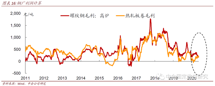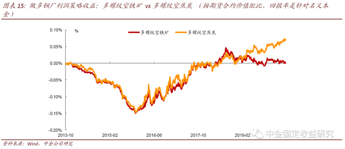 钢厂利润与我们的策略息息相关。成本端主要是铁矿石和焦炭、废钢的原材料价格,2011年2月21日起,毛利=螺纹钢-(2.1*铁矿石+0.58*焦炭+0.18*废钢+轧制费用+其他费用);2016年10月20日起,毛利=螺纹钢-(1.02*钢坯成本+轧制费用+其他费用)。2011年2月21日起,毛利=热轧板卷-(1.78*铁矿石+0.5*焦炭+轧制费用+其他费用);2016年10月20日起,毛利=热轧板卷-(1.03*(钢坯成本+30)+轧制费用+其他费用)。根据以上公式,我们估算了钢厂利润,在2016年中见底,此后爬升至2018年见顶,现在正处于2016年的利润低位附近。但钢厂利润与我们的做多钢厂利润策略的回报走势不完全一致,尤其是多螺纹空焦炭是一直走高的,原因在于铁矿石的成本对钢厂利润的影响弹性较高。