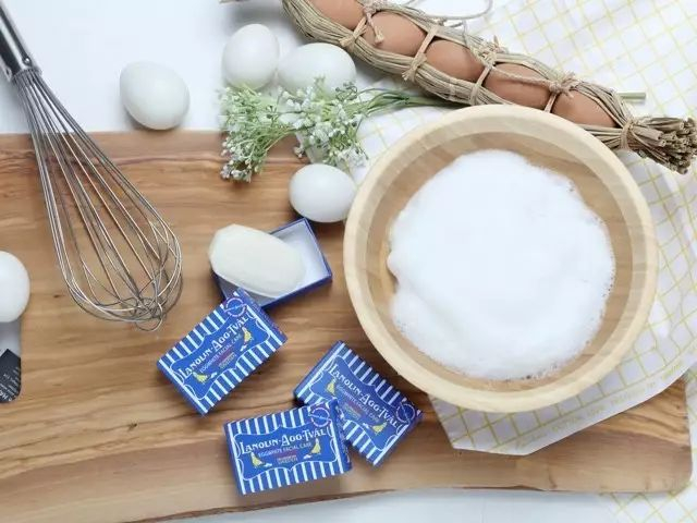 每块蛋清皂都含有大量鸡蛋清,还添加了北欧天然羊毛脂、酸奶乳酸、高山火绒草精华、以及蔷薇花水等成分。