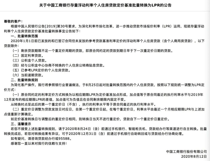 8月12日,工行、农行、中行、建行、邮储银行发布公告称,将于8月25日起,将符合转换条件的存量浮动利率个人住房贷款,批量转换为贷款市场报价利率(LPR)定价。