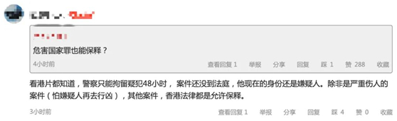 报道提及,全国港澳研究会理事田飞龙也曾解释过,香港司法制度中的保释制度不等于直接把人放了,而是类似于内地刑事诉讼法中的取保候审,这是根据行为人的危害性,还有其事后是否能够配合刑事诉讼程序而作出的一种权衡。
