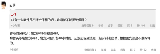 “香港的保释分:警方保释&法庭保释。黎智英等是警方保释,警方只能扣留48小时的。还没起诉到法庭,起诉到法庭时,根据国安法是不准保释的。”