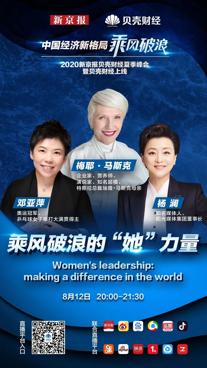 8月12日,由新京报贝壳财经主办的“中国经济新格局:乘风破浪”夏季峰会在线举行。在“她力量”女性领导力论坛上,知名超模、演说家、特斯拉总裁埃隆·马斯克的母亲梅耶·马斯克,知名媒体人、阳光媒体集团董事长杨澜,奥运冠军、乒乓球女子单打大满贯得主邓亚萍,共话女性在全球化背景下的成长和蜕变。