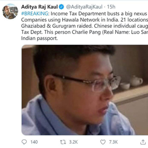 12日上午,独立记者Aditya Raj Kaul在推特在表示,印度所得税部门查处了一群利用哈瓦拉网络洗钱的中国公司,搜查了德里、加沙巴德和古尔冈的21处地点,逮捕了使用假印度护照的Charlie Pang(真名:Luo Sang)。