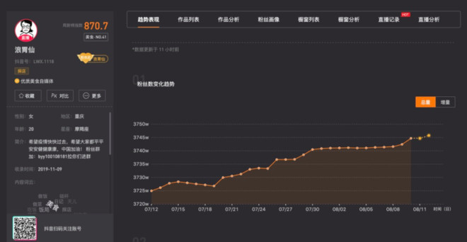 粉丝数方面,据新抖平台提供的数据显示,吃播博主浪胃仙7月12日时粉丝为3725万,到8月11日时粉丝已至3745万,近一个月来涨粉20万。