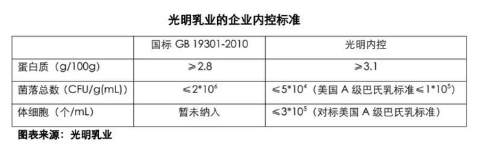 光明内控标准的蛋白质要求为高于3.1g/100g,这高于国家标准,菌落总数内控标准为低于5万个/mL,其标准也远高于国标的200万个/mL,体细胞数对标美国A级巴氏乳标准,为低于30个/mL。