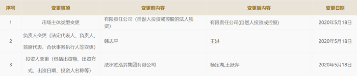 其一是金湖泓达木业制品有限公司(下称“泓达木业”),工商信息显示,其于5月18日发生股权变更,原独资股东法尔胜泓昇集团退出,新增股东杨定湖与王跃萍。泓达木业的市场主体类型亦于同日由“有限责任公司(自然人投资或控股的法人独资)”变更为“有限责任公司(自然人投资或控股)”。