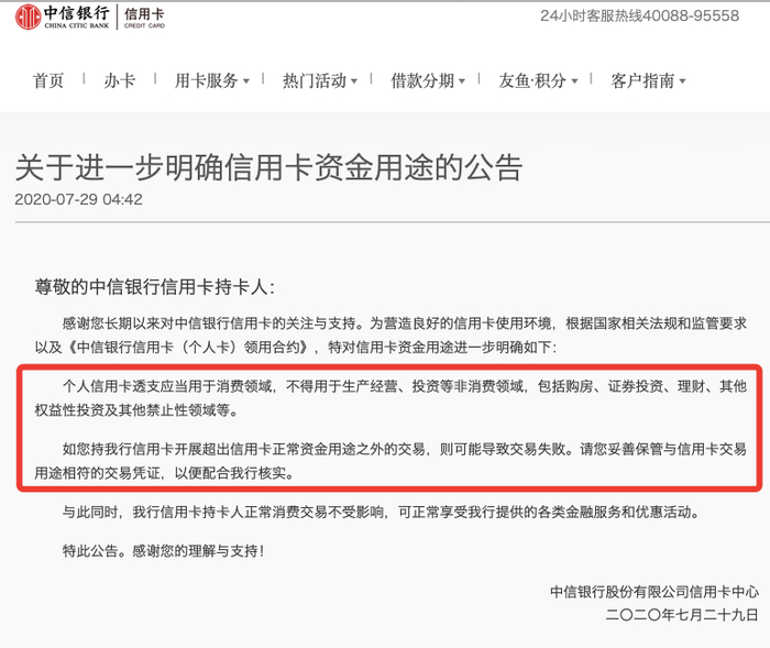 7月29日,中信银行发布《关于进一步明确信用卡资金用途的公告》称,“根据国家相关法规和监管要求以及《中信银行信用卡(个人卡)领用合约》, 特对信用卡资金用途进一步明确:个人信用卡透支应当用于消费领域,不得用于生产经营、投资等非消费领域,包括购房、证券投资、理财、其他权益性投资及其他禁止性领域等。”