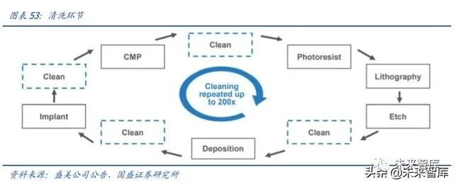 清洁步骤占半导体工艺所有处理步骤 1/3,最多已经达到 200 次。几乎所有制程的前 后都需要清洗环节。