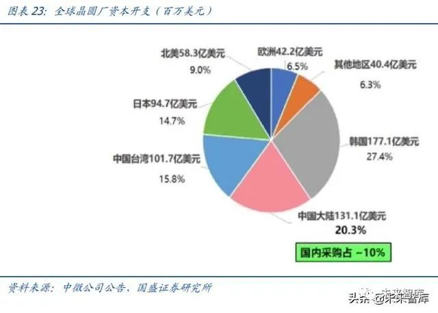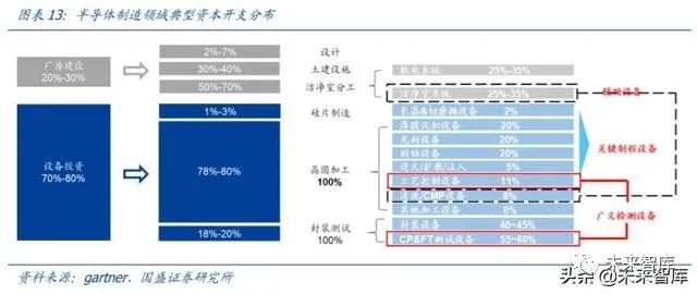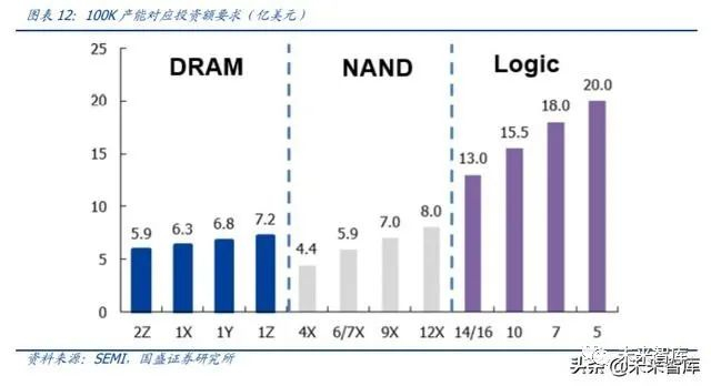 制程越高,设备投资额占比越高。设备投资一般占比 70~80%,当制程到 16/14nm 时, 设备投资占比达 85%;7nm 及以下占比将更高。光刻、刻蚀、沉积、过程控制、热处理 等均是重要投资环节。