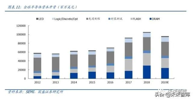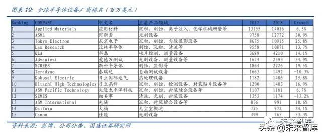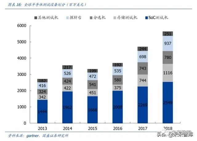 测试需求增长更快。半导体设备 2013~2018 年复合增长率为 15%,前道、封装、测试 分别为 15%、11%、16%。增速最快的子项目分别为刻蚀设备(CAGR 24%)和存储测 试设备(CAGR 27%)。