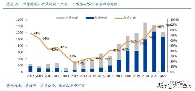 中芯国际火速过会,科创板登陆在即;长存二期(产能从 50K 到 100K)宣布启动, 64 层稳定生产,128 层成功研制。2020~2022 年内资晶圆厂每年规划投资金额均超千 亿,后续有望加大国产设备、材料、OSAT 链条的扶持力度。在国产替代趋势下,目前 产业跟踪来看代工、封装、测试以及配套设备、材料已经开始实质性受益,整体实力得 到显著提升。