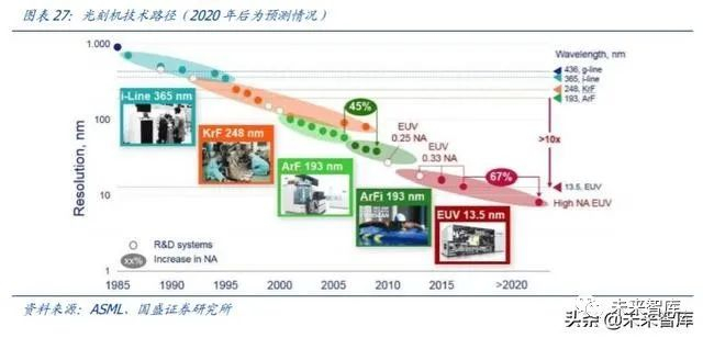 瑞利公式:CD=k1*(λ/NA)。CD 为关键尺寸,为了降低 CD,有三种方式:(1)降低波 长λ;(2)提高镜头的数值孔径 NA;(3)降低综合因素 k1。