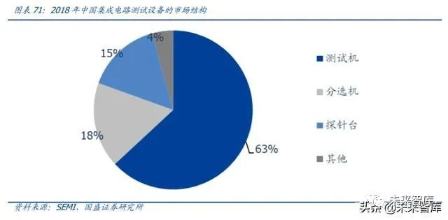 随着国内封测厂陆续投入新产线,产能实现扩张,将持续带动国内半导体测试设备市场 高速增长。根据 SEMI,2018 年国内集成电路测试设备市场规模约 57.0 亿元,集成电路 测试机、分选机和探针台分别占比 63.1%、17.4%和 15.2%,其它设备占 4.3%。