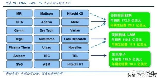 CCP:能量高、精度低,主要用于介质材料刻蚀(形成上层线路)——诸如逻辑芯片的 栅侧墙、硬掩膜刻蚀、中段的接触孔刻蚀、后端的镶嵌式和铝垫刻蚀等,以及 3D 闪存 芯片工艺(氮化硅/氧化硅)的深槽、深孔和连线接触孔的刻蚀等。2015 年 20 亿美元, TEL、LAM 合计市占率达 80%以上。