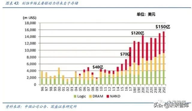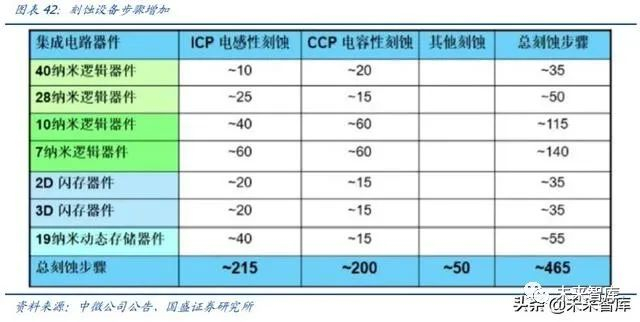 产业发展趋势:(1)0.13um 工艺的铜互连技术出现时(300mm 时代),金属刻蚀比例 下降,介质刻蚀的比例大幅上升。(2)30nm 之后的,多重图像技术、软刻蚀应用的提 升,硅刻蚀(ICP)的占比快速提升。(3)数十层的金属互联层(后道工艺,BEOL),精 度一般在 20nm 以上的以 CCP 为主;CMOS 核心器件(前道工艺,FEOL)线宽比较少, 往往使用 20nm 以下的 ICP。(4)EUV 在 foundry/DRAM 的采用,使得刻蚀步骤减少;3D Nand 采用,使得刻蚀步骤增多,高深宽比刻蚀需求增多。