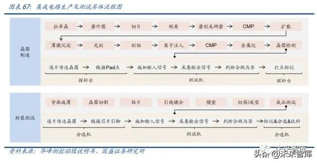 半导体测试包括晶圆允收测试(WAT)、晶圆检测(CP)、成品测试(FT) 。WAT 环 节涉及测试机、分选机、探针台;CP 由测试机、探针台搭配完成;FT 涉及测试机、分 选机搭配完成。