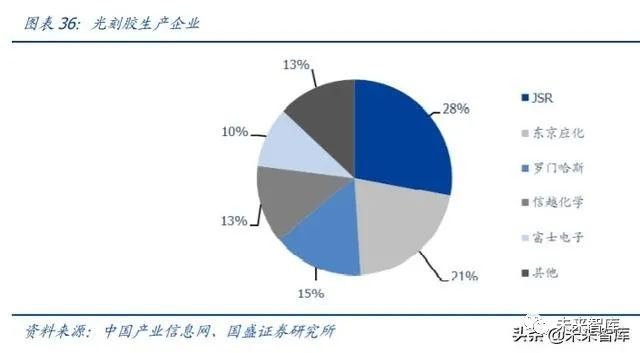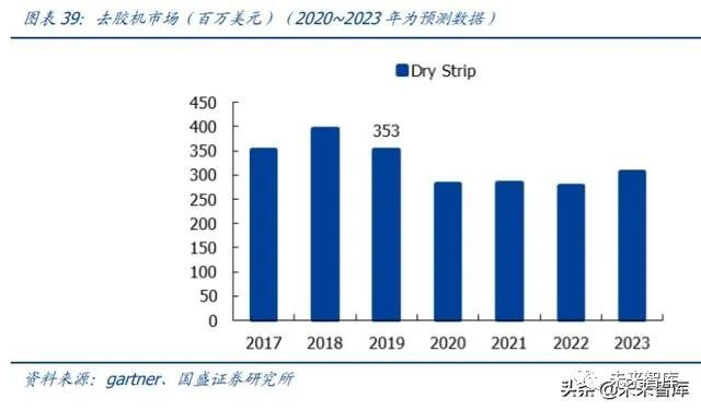 根据 Gartner,2018 年晶圆设备涂胶显影市场约 22.6 亿美元,占半导体设备比重为 4%。市场由日韩厂商主导:东京电子一家独大,占涂胶显影市场 90%;剩下市场 SCREEN(日)、 SEMES(韩)合计约占 10%。根据 VLSI 数据,2018 年中国大区(含中国台湾)前道涂胶显影设备市场 8.96 亿美元,2023 年将达到 10.26 亿美元。