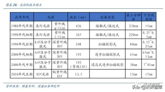 光源升级:1985 年之前,以 g 线(436nm)为主,最小线宽为 1um 以上;1985 年以后, 出现少量 i 线(365nm)光刻机,最小线宽 0.5um;1990 年开始出现 DUV 光刻机,最 小线宽为 0.25um;踏入 21 世纪,193nm 的深紫外线开始使用。