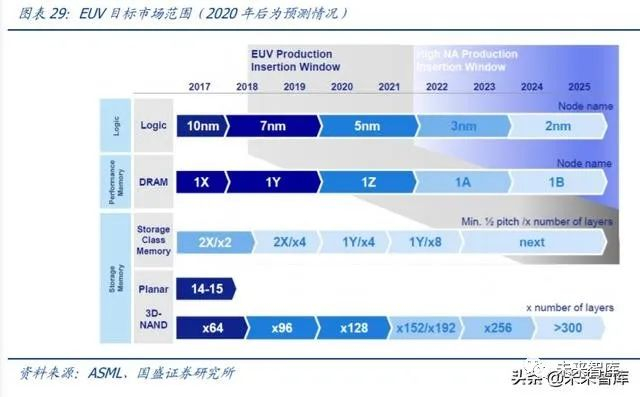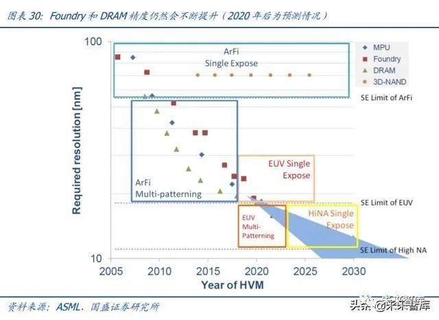 EUV 的采用利好光刻、过程控制(ASML、KLA)。根据 ASML,45K/M 的 logic 产能, 每一层需要一台 EUV;100K/M 的 DRAM 产能,每一层需要 1.5~2 台 EUV。预估 TSMC N7 使用 7 层;N5 使用 14 层。ASML 预估 EUV 层数 10~20 层,目前工艺总层数多达 400~600 层。