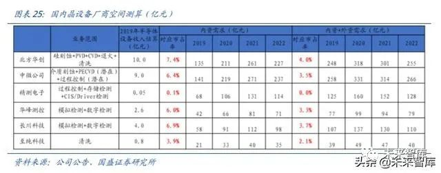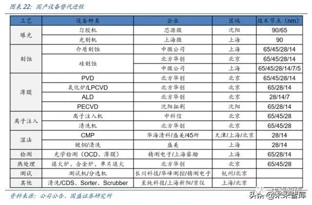 国内国产化逐渐起航,从 0 到 1 的过程基本完成。中微公司介质刻蚀机已经打入 5nm 制程。北方华创硅刻蚀进入 SMIC 28nm 生产线量产。Mattson(屹唐半导体)在去胶设 备市占率全球第二。盛美半导体单片清洗机在海力士、长存、SMIC 等产线量产。沈阳拓 荆 PECVD 打入 SMIC、华力微 28nm 生产线量产,2018 年 ALD 通过客户 14nm 工艺验 证。精测电子、上海睿励在测量领域突破国外垄断。