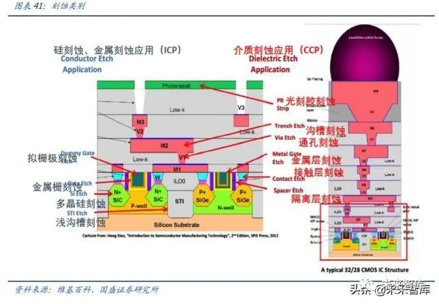 ICP:能量低、精度高,主要用于硅刻蚀和金属刻蚀(形成底层器件)——硅浅槽隔离 (STI)、锗(Ge)、多晶硅栅结构、金属栅结构、应变硅(Strained-Si)、金属导线、金 属焊垫(Pad)、镶嵌式刻蚀金属硬掩模和多重成像技术中的多道刻蚀工艺。