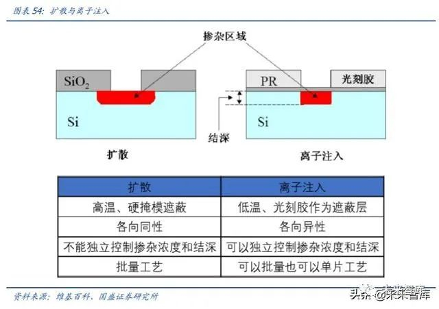 扩散(Diffusion):通过高温热处理作用将扩散源(固态源、液态源、气态源等)扩散 到圆片衬底上,也称为热扩散。扩散工艺设备简单、扩散速率快、掺杂浓度高,但扩散温度高、控制精度低,离子注入出现逐渐被其替代。