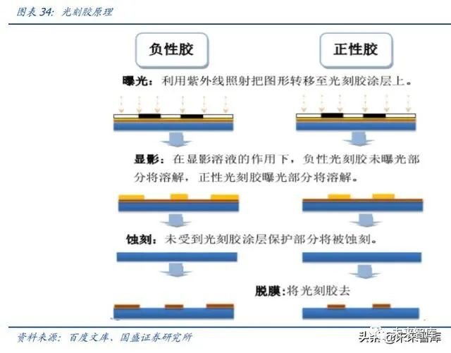 光刻胶主要是作为将光刻掩膜板上的图形转移到晶圆片上的媒介。正性光刻胶之曝光部 分发生光化学反应会溶于显影液,负性光刻胶之曝光部分因交联固化而不溶于显影液。