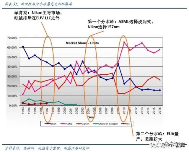 光刻机发展历史,两次技术分水岭奠定格局变化。2003~2004 年为第一个分水岭:ASML 选择浸润式,Nikon 选择 157nm。2010 年为第二个分水岭:EUV 量产,差距拉大。