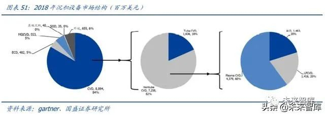 2018 年薄膜沉积设备达到 132 亿美元,占晶圆设备约 22%。薄膜沉积中 84%是 CVD;CVD 中 82%是非管式 CVD;Nontube CVD 中最主流的设备是等离子体 CVD、LPCVD、 ALD 等。