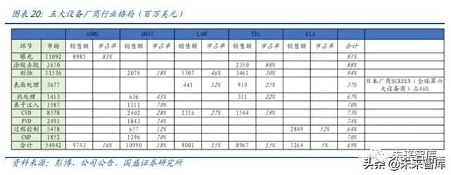 综合看下来,设备五强市场在各赛道合计市占率基本在 50%以上。AMSL 优势在光刻方 面遥遥领先;AMAT 优势在产品线广,沉积(CVD、PVD)市占率高;LAM 优势在刻蚀领 域;TEL 优势在小赛道如涂胶、去胶、热处理;KLA 优势在过程控制。