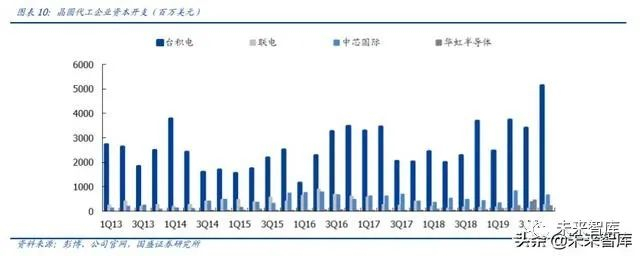 Capex 进入上行期,台积电、中芯国际纷纷增加资本开支。台积电率先推进大幅资本开 支提升,推进先进制程应用。台积电 2018 年资本开支 104 亿美元,2019 年提升至 148 亿美元,2020 年预期 150~160 亿美元。中芯国际 2019 年资本开支 22 亿美元,预期 2020 年上升至 43 亿美元,开启新一轮资本开支。