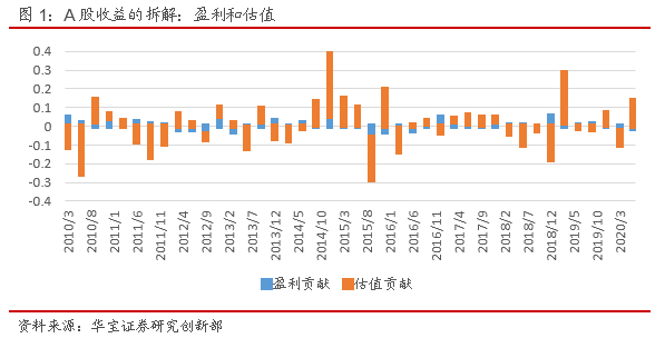 采用沪深300指数作为A股的代表,净利润TTM环比值作为企业盈利的代表,将A股收益拆解为盈利贡献和估值贡献,其中估值贡献为A股收益减去净利润增速。采用季度数据,统计时间为2010年至2020年6月30日,从下图可以看出,盈利变动较小,估值贡献了A股绝大部分收益,并且A股市场的波动主要源自于估值的变化。