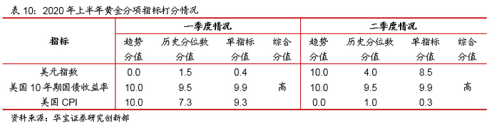 与前文方法相同,根据指标趋势和历史分位数情况得到当前分值,通过加权得到总分值,分值范围在0~10分,划分6~10分作为较强的情况,4~6分位中性,0~4分作为较弱的情况,采用COMEX黄金期货作为黄金价格的代表,分析时间为2010年至2020年6月30日,分析结果如下: