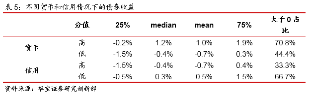 从历史统计可以看出,在宽货币的情况下,债券投资收益的平均水平高于货币收紧的情况,同时正收益的占比达到70%。对于信用端,在收紧信用的情况下债券投资收益的平均水平高于宽信用的情况,同时收益率大于0的占比达到66%。整体来看,在宽货币或者紧信用的情况下债券表现相对较好。