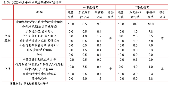 基于上述指标,我们采用量化综合打分的方法,对企业盈利及估值所处状况进行定量描述,并进一步统计不同状况下的A股历史收益。我们将上述指标的趋势以及历史分位数(过去5年分位数)映射为分值,其中趋势项描述指标走势,历史分位数刻画指标所处的位置。对于正向指标,当趋势上行时定义为10分,趋势下行时定义为0分,历史分位数的分值为10*历史分位数,反之对于负向指标,当趋势上行时分值为0分,趋势下行时为10分,历史分位数的分值为10*(1-历史分位数),对趋势项以及分位数项分值加权得到单指标的分值。接下来对每个指标给予一定的权重,通过加权得到企业盈利和估值维度的分值情况,分值范围在0~10分, 通过划分7~10分作为较强情况,3~7分位中性,0~3分作为较弱情况,分别统计企业盈利贡献和估值贡献情况,具体如下(统计时间为2010年至2020年6月30日):