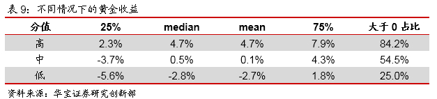 从上述分析结果可以看出,当分值越高时,黄金的平均收益和收益大于0的占比越高,收益率大于0的占比达到84.3%,季度平均收益率达到4.7%,对于中性水平下,收益率大于0的占比达到54.5%,季度平均收益率达到0.1%,当分数较低时,平均收益回落至-2.7%,收益大于0的占比仅有25%。