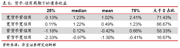 在宽货币、紧信用状态下债券投资的平均收益最高,收益率大于0的占比高于70%。紧货币、宽信用情况下,债券投资回报最低,平均收益为-1.30%。对于宽货币、宽信用,以及紧货币、紧信用情况,收益状况在4种状态中介于中间情形,这符合前文我们分析的逻辑。此外,我们还发现,宽货币、宽信用情形下的收益要好于紧货币、紧信用情形,这说明对于债券市场,货币周期的轮动在资产定价中最为重要,是第一位的。