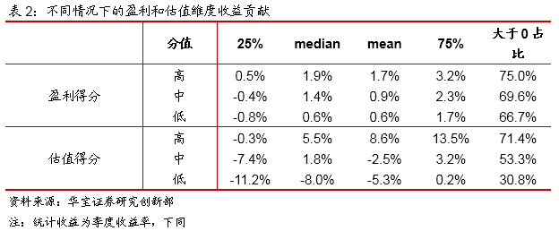 从历史统计来看,盈利维度处于中性至乐观情形时,盈利端平均季度收益贡献在0.9%~1.7%之间,估值端乐观情况下季度平均收益贡献在8.6%。胜率方面,综合盈利和估值维度,历史上类似情形下收益率大于0的占比在70%左右。